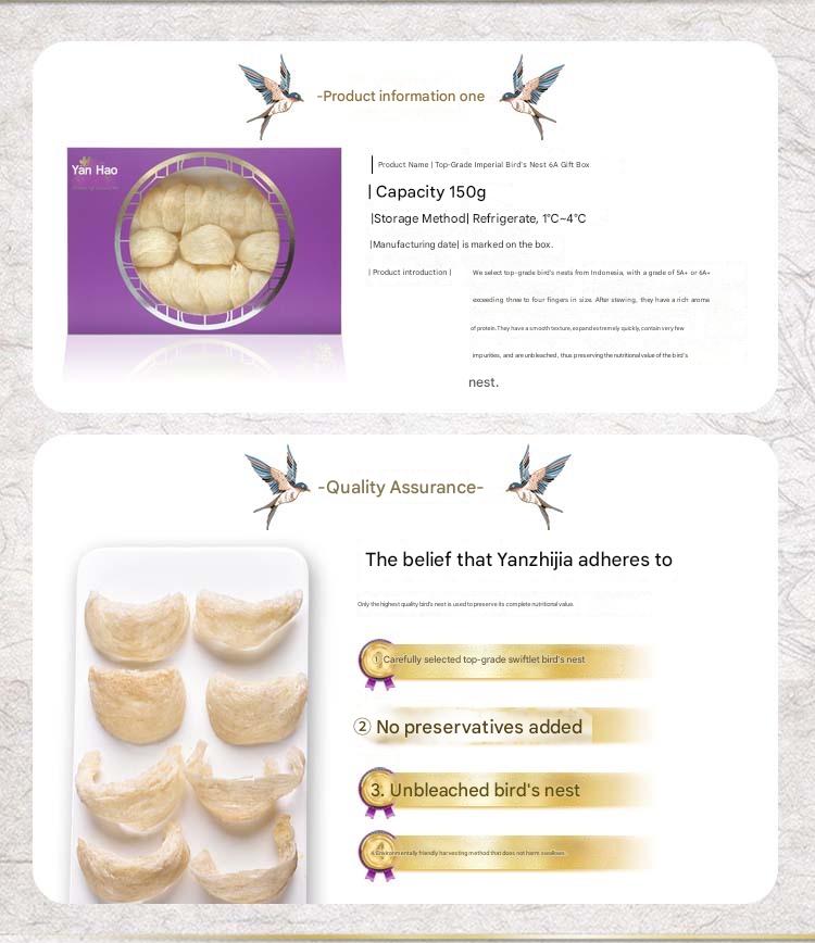 |Product Introduction|Strictly selected Indonesian 5A+ top-quality bird’s nests with more than three to four fingers. The protein has a rich aroma after being stewed. The taste is smooth, the hair multiple is extremely high, there are very few impurities and it does not bleach, and the nutritional value of the bird’s nest is completely preserved.